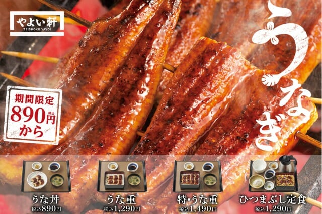 「やよい軒」では、夏のスタミナ源として親しまれているうなぎを丼や定食で楽しめる『うな丼』890円、『うな重』1,290円、『特・うな重』1,490円、薬味や出汁をかけて食べる『ひつまぶし定食』1,290円の4商品と、テイクアウトの『おうち定食』3商品を、6月16日(水)より発売します。