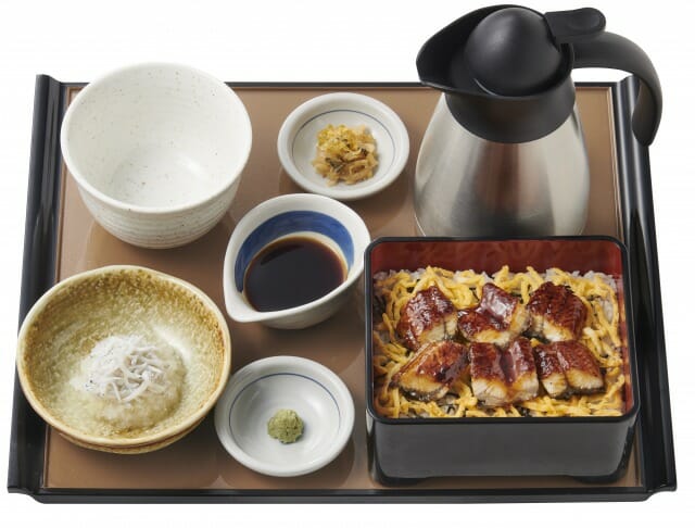 『ひつまぶし定食』は、うなぎの蒲焼と錦糸玉子をごはんにのせ、かつお節や昆布の風味が効いた合わせ出汁を付けました。まずは特製だれをかけてうなぎを味わい、薬味のわさびで味の変化を楽しみ、最後に合わせ出汁をかけてだし茶漬けとしてさらっと食べるなど、好みの食べ方でうなぎを楽しむことができます。