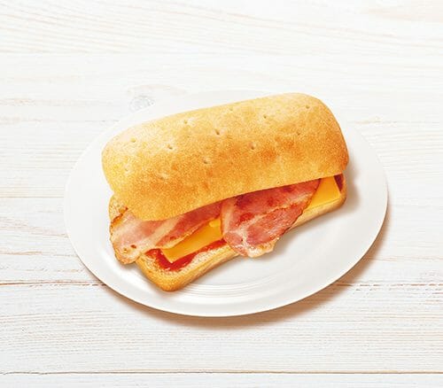 香ばしく、外はパリッと、中はもっちりした食感の“チャバタ”を使用した商品となっています。ベーコンとチーズ、バターの風味が効いたケチャップを合わせたシンプルな仕立てとなっています。