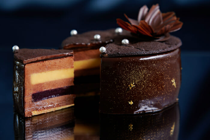 濃厚なムースショコラに甘酸っぱいカシスジュレ、爽やかなオレンジのクリームを合わせました。大人の為の上品なムースショコラとなっています。