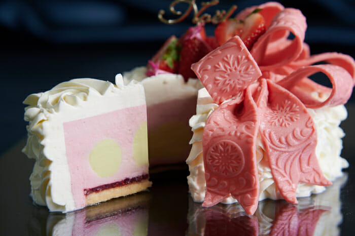 ウエディングパティシエが作る特製クリスマスケーキは、プリンセスをイメージしたグラデーションカラーのドレスケーキ、大きなリボンと薔薇の模様があしらわれた苺とフランボワーズのムースケーキ、ムースショコラの3種類を用意しました。