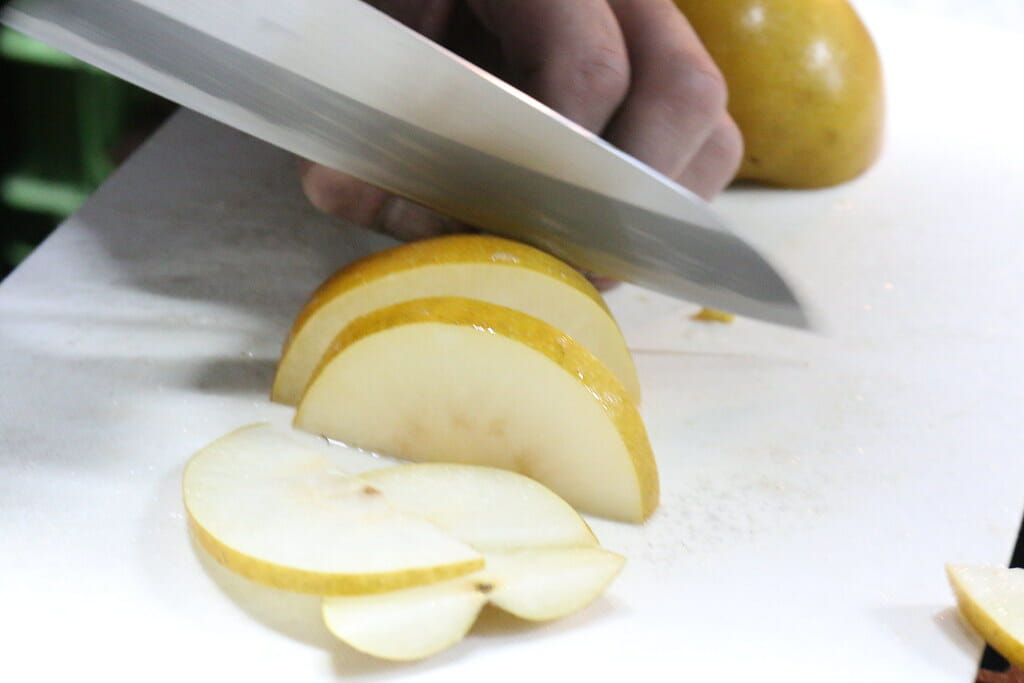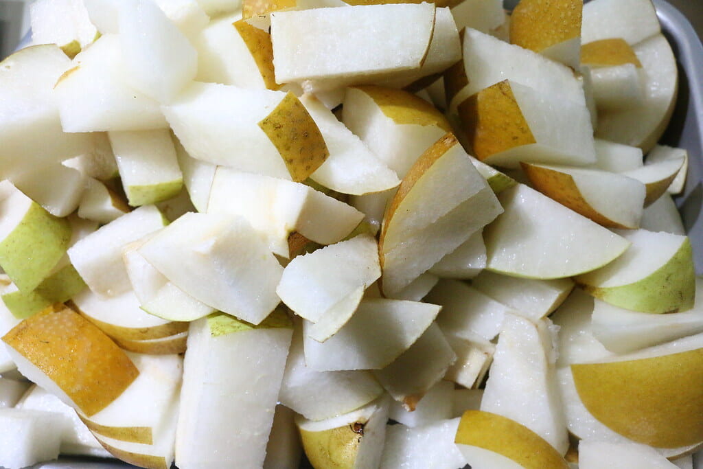 梨は細切れにしたもの、ペーストに加工したもの、ジュースに加工したものを3段階に分けて加えています。