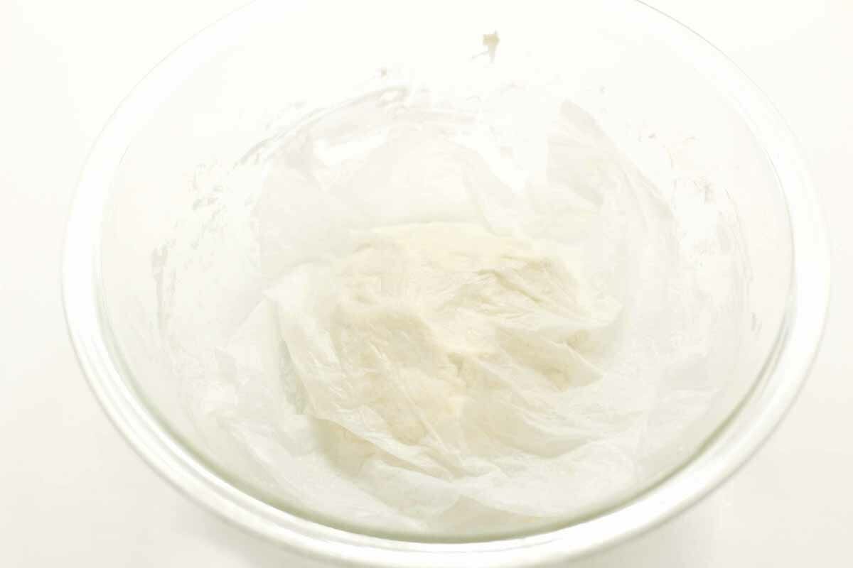 4. 丸めた生地に濡らしたキッチンペーパーをかぶせ、200wの電子レンジで20秒温める。温めが終わったら、そのまま15分置いておく
