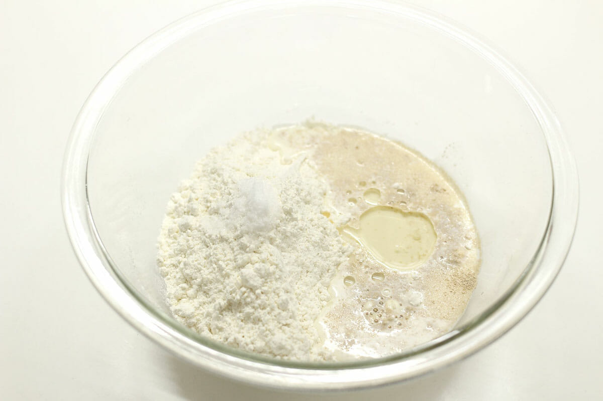 ボウルの端に強力粉を寄せるように入れ、もう一方の片側に砂糖・お好みの油・牛乳・ドライイーストを入れます。塩を強力粉の上に乗せ、塩が最後に合流するように混ぜて丸めましょう。