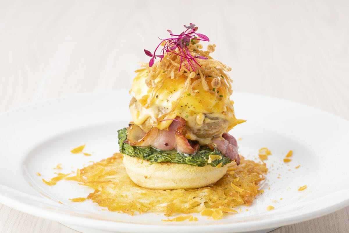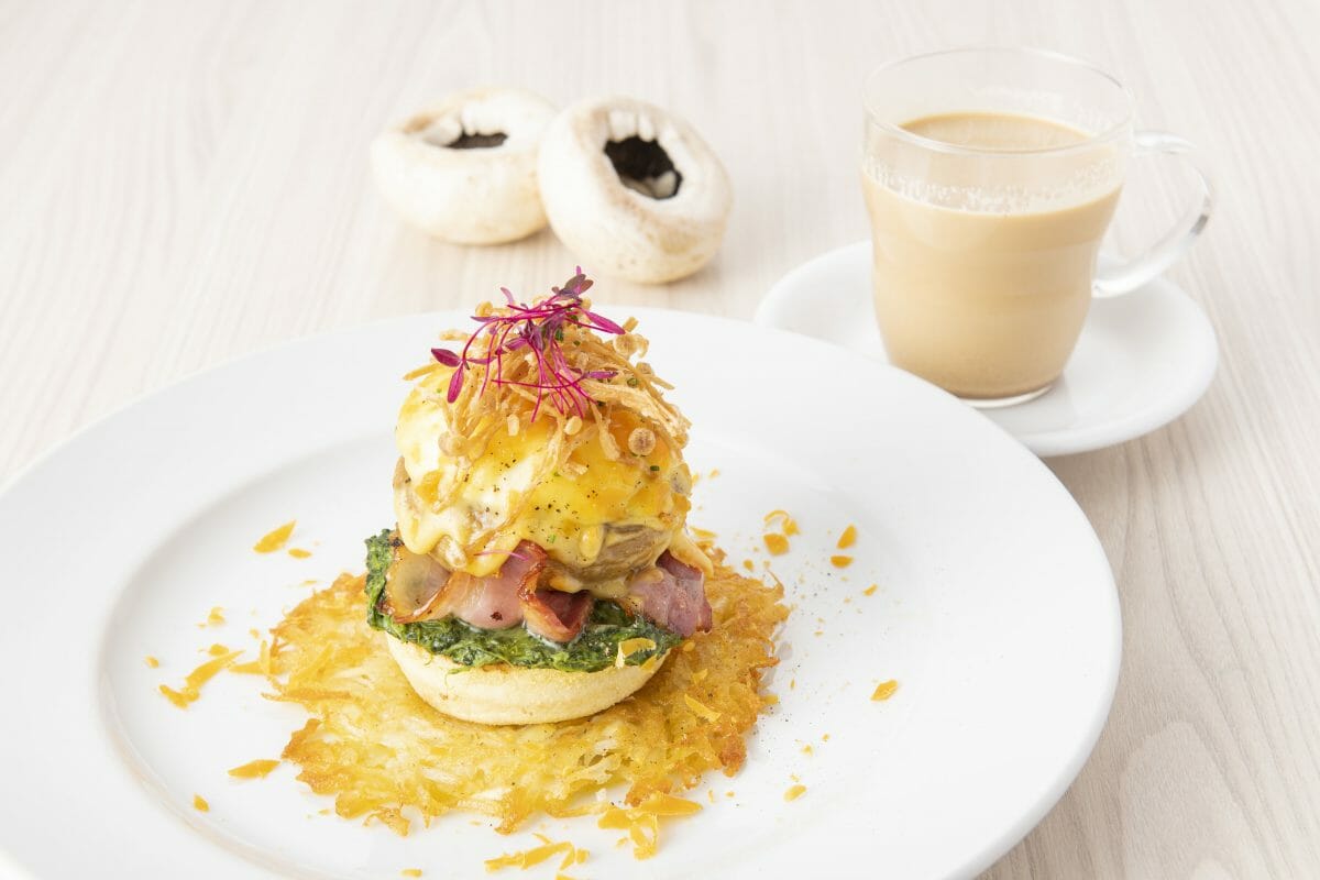 「ローストマッシュルームベネディクト」は、手のひらほどの大きさ、そして肉厚で食べ応えのあるジャンボマッシュルームに、ナツメグ香るクリームスピナッチ、薫香たつベーコン、プルプルの半熟卵とクリーミーなオランデーズソースを、トーストした自慢のマフィンにのせた、秋の旬を凝縮したかのようなスペシャルエッグベネディクト。ジャンボマッシュルームは丸ごとオーブンでローストし、味を閉じ込めるようジューシーに仕上げています。そしてマフィンの下に敷かれているのは、香ばしく焼き上げたジャガイモのガレット。これを崩して絡ませれば、香りだけでなくカリカリの食感が風味にアクセントを生み出します。 仕上げにトッピングしたミモレットチーズとエノキフリットがジャンボマッシュルームの旨味を引き立たせています。