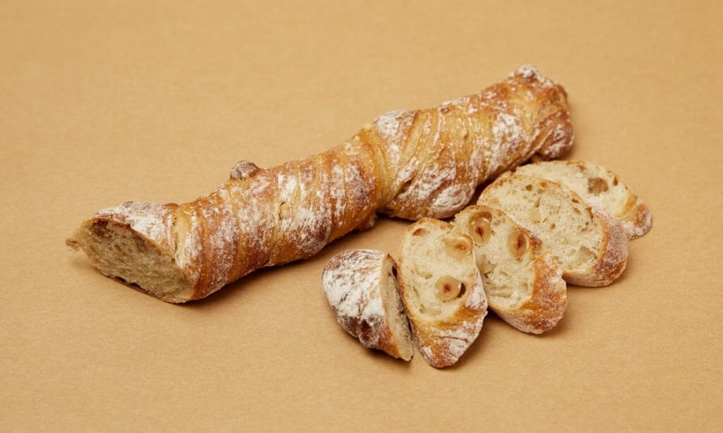 バゲット生地にマロングラッセとエスプレッソに漬け込んだヘーゼルナッツを練りこんで焼き上げました。ほのかにエスプレッソが香ります。