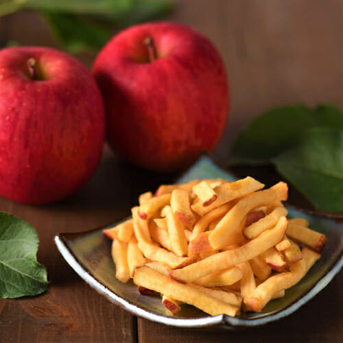 青森で創業から100年を超えるりんごの卸商が、りんごの収穫が終わった春と夏もなんとか働けるようにしたいと、りんご加工に取り組みました。その思いに共感した地元老舗菓子メーカーが製品化に協力し、二人三脚で作り上げたのが「青森りんごっくる」となっています。りんごの王様「ふじ」をカットしてシロップに浸し、真空フライヤーで揚げることで、不思議な食感のスナックができ上がりました。油で揚げてあるとは思えないほど、軽やかでサクッとした口当たりの後に、しっとりとしたりんご本来の甘みと酸味を感じ、次々と手が伸びてしまいます。