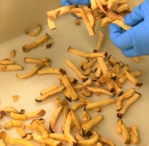 低温真空フライは非常に手間暇かかるので、この方法で作られるお菓子は全国的に見ても多くはありません。特に、揚げた後はスティック状のりんごが塊になっているため、冷めないうちに1本1本手作業で離しています。スティックが折れないように行う必要がある、とても繊細な作業となっています。手間暇はかかりますが、噛めばじんわり生のりんごの記憶が蘇る、一味違う味わいの、他にはないりんごスナックとなっています。