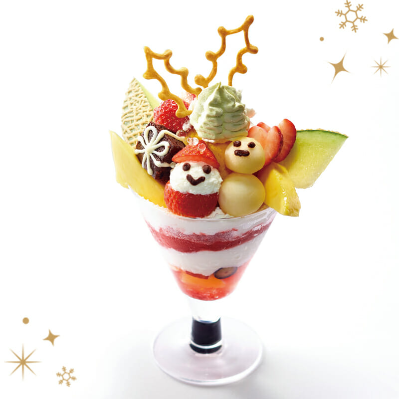 可愛らしいサンタや雪だるまとフルーツがカラフルに彩るパフェです。苺りんごグラニテにまろやかなフロマージュムースを重ね、下層にはさっぱりとしたフランボワーズゼリーでまとめ上げています。