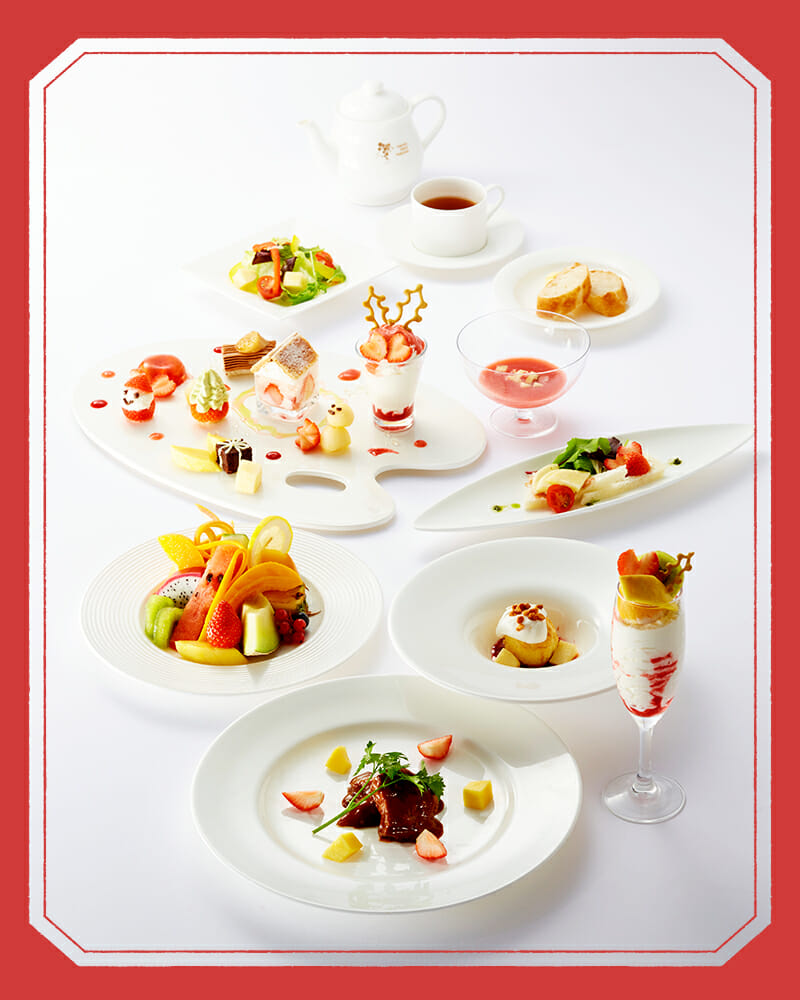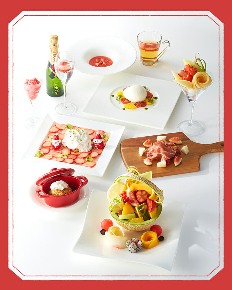 アペリティフ/苺とオレンジとブッラータのカプレーゼ/紅ほっぺ苺とりんごのスープ/ガローニプロシュートのサラダ/苺のグラニテ/フルーツアート/紅ほっぺ苺のパイ/Xmasデザート/三種パフェ/紅茶