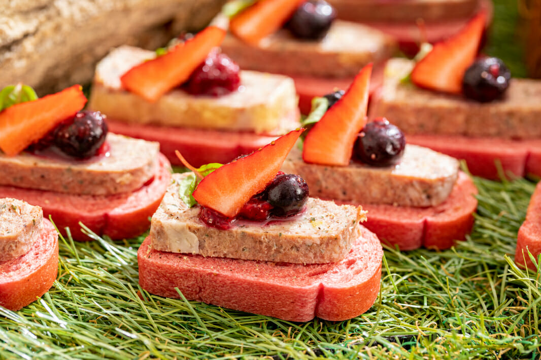 ポークとピスタチオのパテドカンパーニュを、いちごのパンにのせて、フレッシュいちごをあしらいました。塩気とさっぱりしたいちごの酸味がよく合います。
