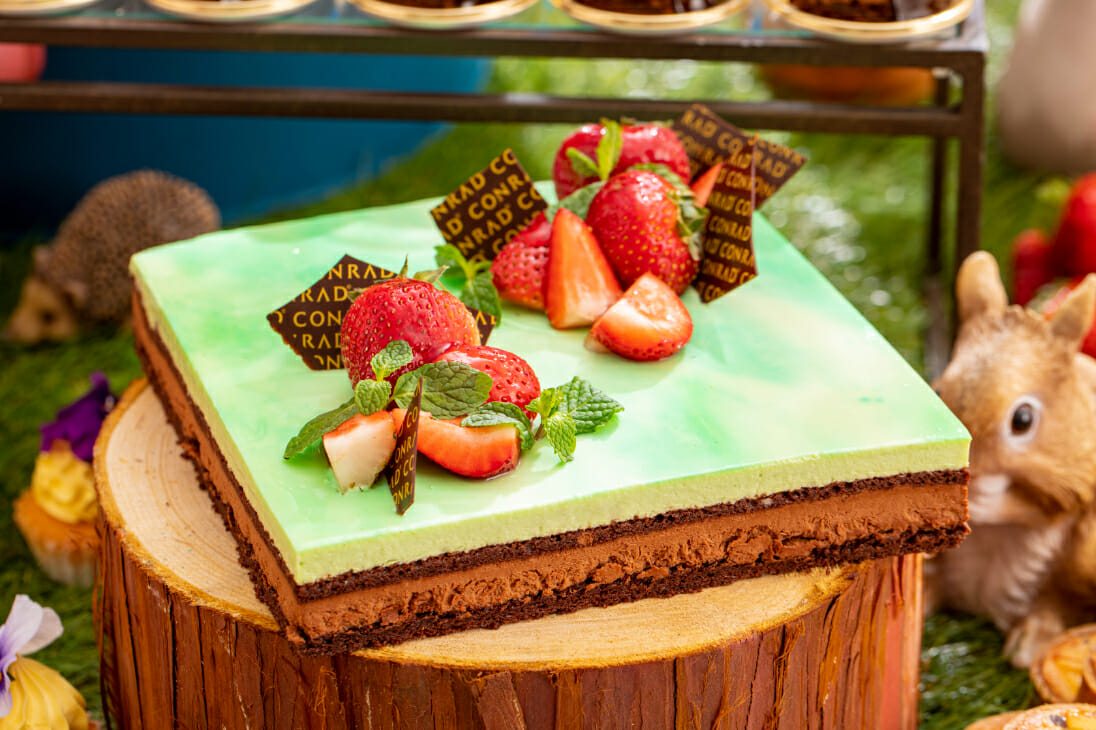 「ストロベリー・イン・ザ・フォレスト」と題し、緑広がる森の中に現れた夢のようないちごスイーツの世界を表現しました。季節の真っ赤ないちごを使用し、ペストリーシェフ 岡崎正輝がしっかりといちごを感じられるよう、ひとつひとつ丁寧に考案した魅力的なスイーツの数々。ビュッフェ台には森の小さな仲間たちも顔を出します。家族や友人、大切な人と、いちごの世界に囲まれて一口ごとに幸せが広がる時間を体験できるようになっています。
