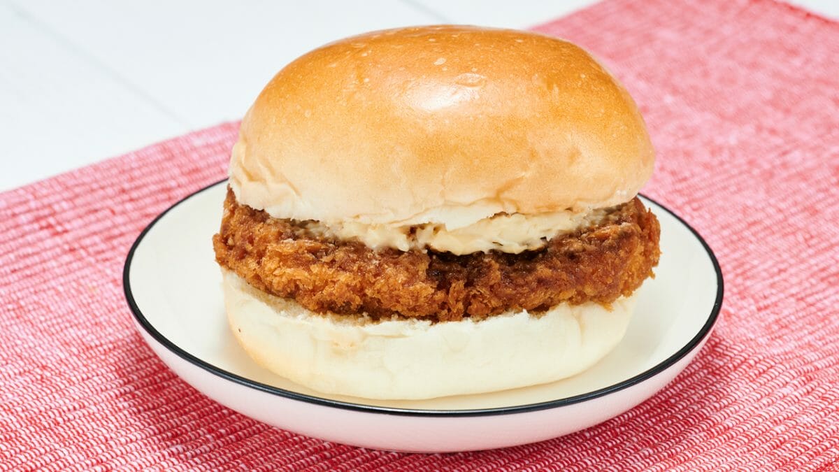 ふんわりとしたバンズに、ソースをつけたチキンカツとマヨネーズをサンドしました。