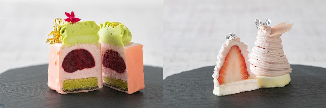 ▲(左)桜香るムース チェリーコンポート ピスタチオクリーム (右)丸ごとストロベリーモンブラン