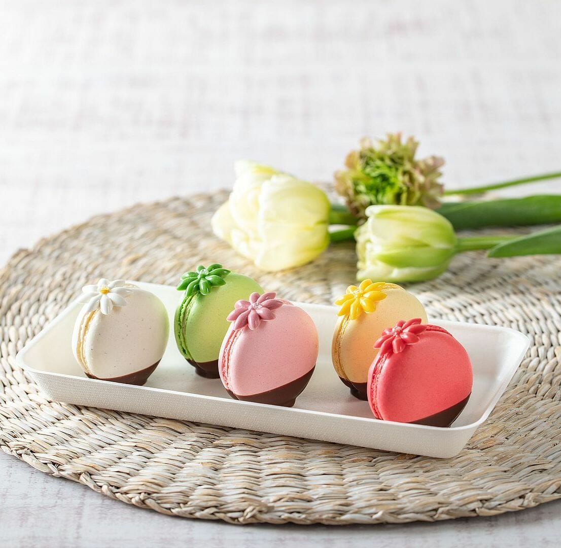 外側はさくっと、中はしっとりした色とりどりのマカロンは、軽やかなクリームの程よい甘さと香り豊かな味わいに。お花のチョコレートトッピングで春にふさわしい華やかな仕上がりとなっています。
