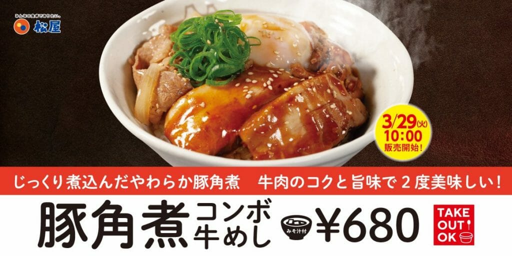 松屋フーズ(本社:東京都武蔵野市、代表取締役社長:瓦葺一利)では、牛めし・カレー・定食・その他丼の「松屋」において、2022年3月29日(火)午前10時より「豚角煮コンボ牛めし」を発売します。