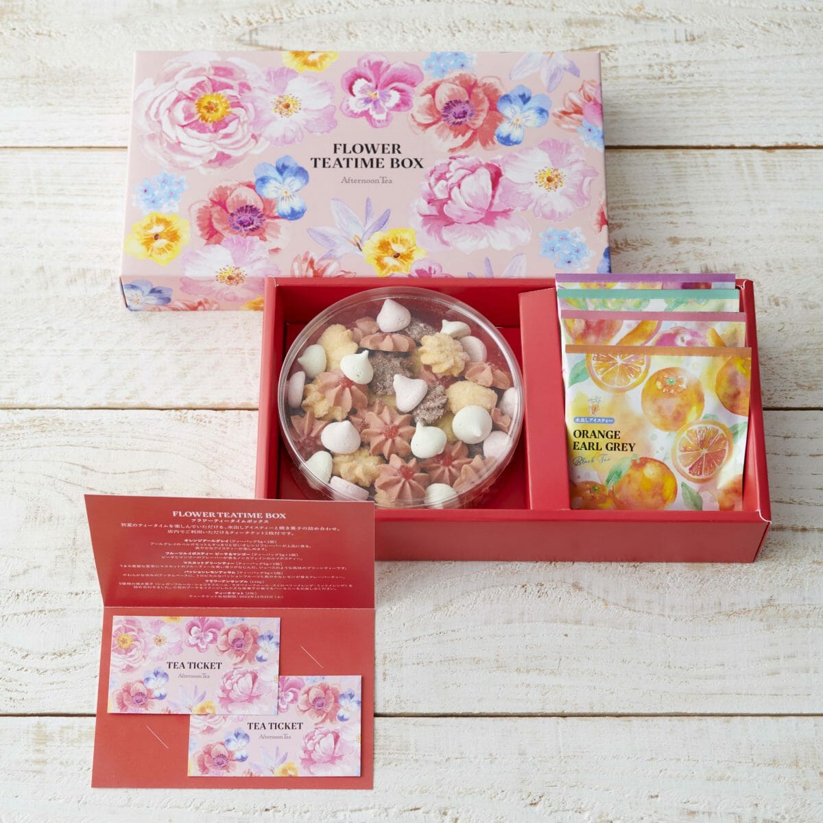 水出しアイスティーと小花のブーケをイメージした5 種の小さな焼き菓子、アフタヌーンティー・ティールーム店内で利用できるティーチケットをセットにした「フラワーティータイムボックス」や鮮やかなカーネーションブーケと紅茶、焼き菓子をセットにした「フラワーティータイムセット カーネーションブーケ」(楽天ウェブストア限定)など、母の日向けのギフトを用意しました。