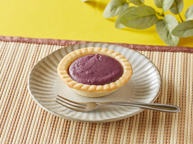 沖縄県産紅芋を使用した、色鮮やかで濃厚な味わいのタルトとなっています。砕きアーモンド入りのタルト台にホワイトチョココーティングをし、紅芋生地をあわせました。