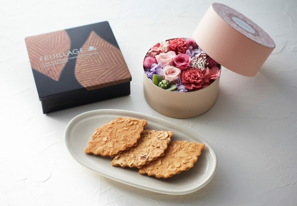 スライスナッツをしきつめてパリッと香ばしく焼き上げたクッキーにバランス良くチョコレートをサンドした「ファヤージュ」。モロゾフ人気のクッキー、「ファヤージュ」とフラワーショップ「堂島花壇」が心を込めて形にしたプリザーブドフラワーがコラボレーションしました。