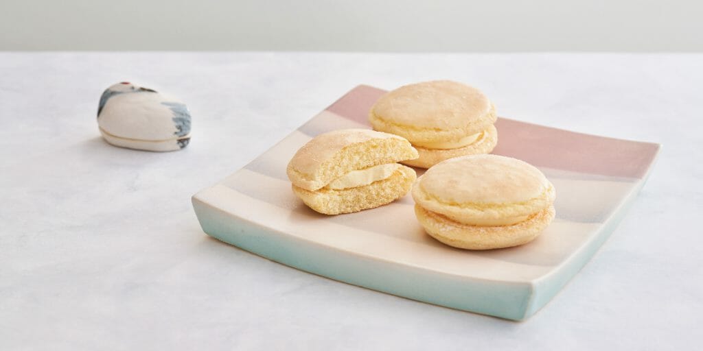 ふんわり軽い口あたりのブッセで、特製のまろやかなバタークリームをはさんだ 「雪鶴」は、発売当初は職人がひとつひとつ手作業でブッセ生地をまぜ、絞り、バタークリームをはさんで製造していました。全ての工程が手作業のため均等に同じというわけにはいかず、手作業ならではの無骨な荒々しさがありました。また、はっきりとした味わいが好まれていた背景もあり、バタークリームの塩味も現在よりも濃いものだったそうです。