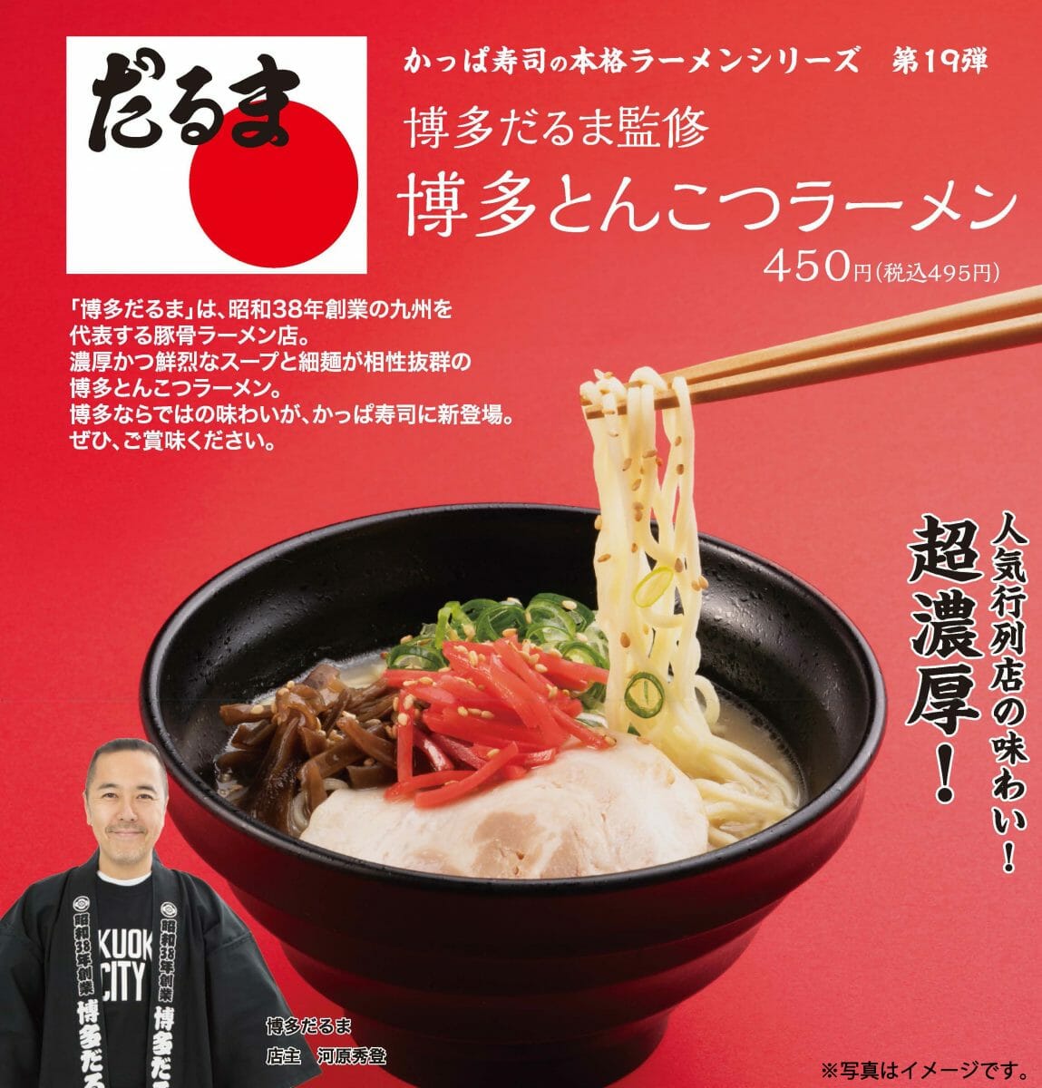コロワイドグループのかっぱ寿司は、2022年5月10日(火)より、「本格ラーメンシリーズ」第19弾となる「博多だるま」監修『博多とんこつラーメン』をかっぱ寿司全店にて販売します。
