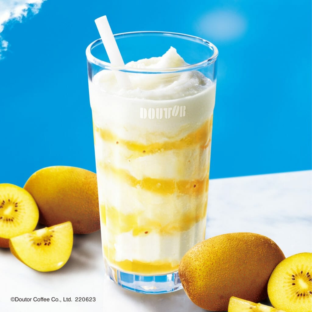 ドトールコーヒーショップオリジナル、ヨーグルト風味のフローズンドリンク「ヨーグルン」に、佐賀県産ゴールドキウイを使用したソースを合わせました。キウイのジューシーな甘さと爽やかな酸味が楽しめるフローズンドリンクです。