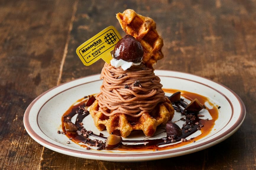日本で初めてベルギーワッフル焼いたお店「マネケン」とコラボレーションしたワッフルデザートは、秋らしい渋皮栗の味わいを丁寧に引き立てた「クラシックモンブラン」と、アメリカンハンバーガーショップ「J.S. BURGERS CAFE」らしくポップにモンブランを演出した「アメリカンモンブラン」。