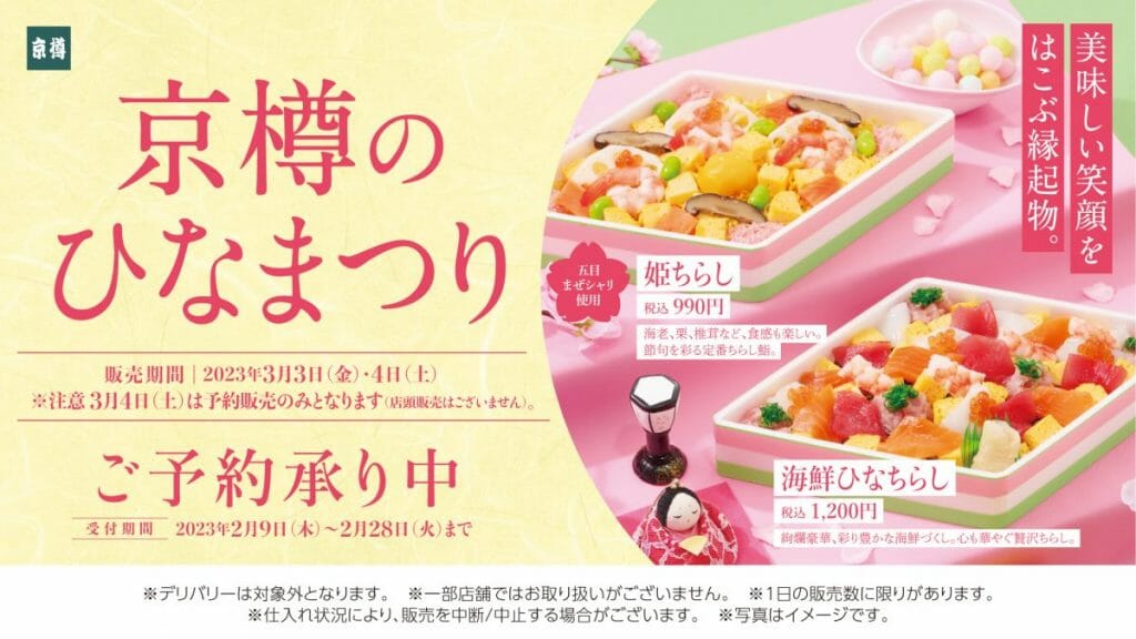 株式会社 京樽(本社:東京都中央区、代表取締役社長:堀江 陽)は、お持ち帰り鮨専門店「京樽」にて、毎年ご好評のひなまつり限定商品を、3月3日(金)~4日(土)※の2日間限定で販売します。(※3月4日(土)の販売は予約限定となります。)