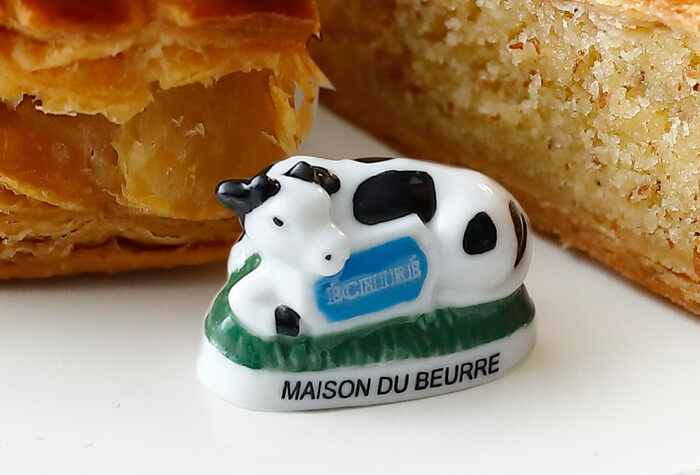 “ガレット・デ・ロワ”のお楽しみのひとつである『フェーヴ』は、エシレ村で放牧されているホルスタイン牛がモデルのオリジナル。「ÉCHIRÉ」のネーム プレートを抱えてのんびり佇む姿にほっこり癒されるとファンも多いデザインとなっています。
