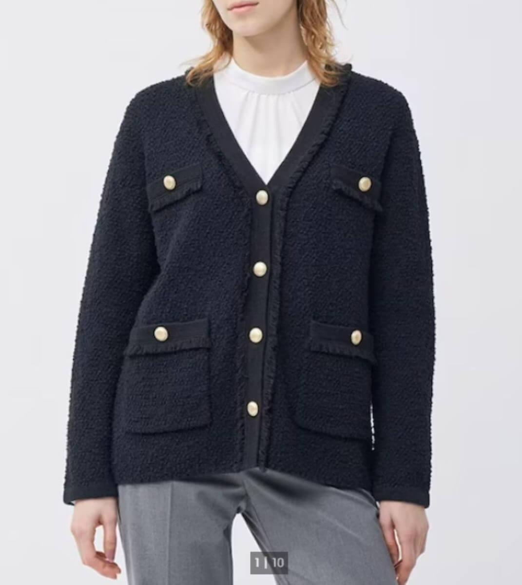 さらに、GU公式サイトによると「2種類の糸をミックスした編み地と金ボタンがポイントです。デニムボトムスと合わせてカジュアルな着こなしを楽しむのがおすすめ」とのこと。