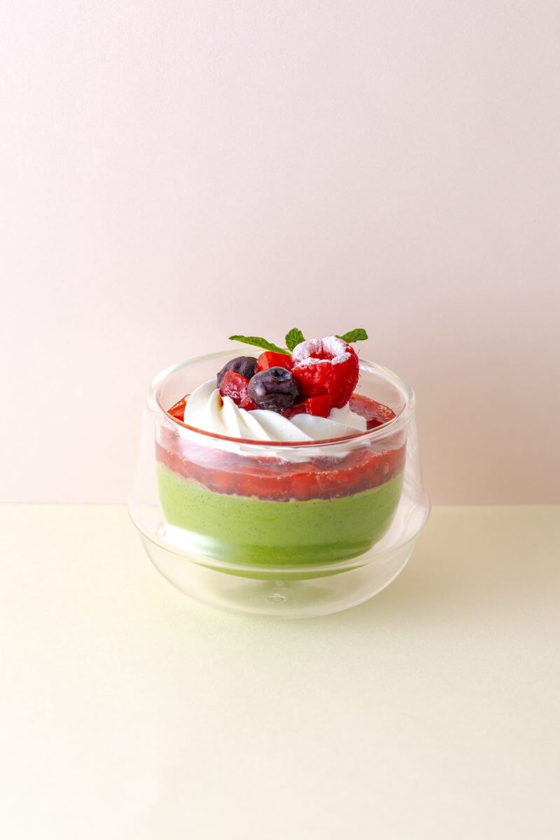 つるんとしながらも滑らか食感のMATCHAムースを口に入れた瞬間、MATCHAのほろ苦さと旨味が広がり、甘酸っぱいベリーソースと甘いホイップクリームがMATCHAの味わいを引き立てます。甘さ控えめ、暑いシーズンに食べたくなる冷たいMATCHAデザートとなっています。