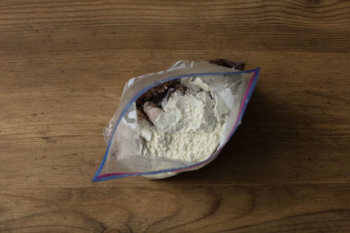 もう一度袋を開け、片栗粉大さじ6(約60g)入れ、全体になじませます。