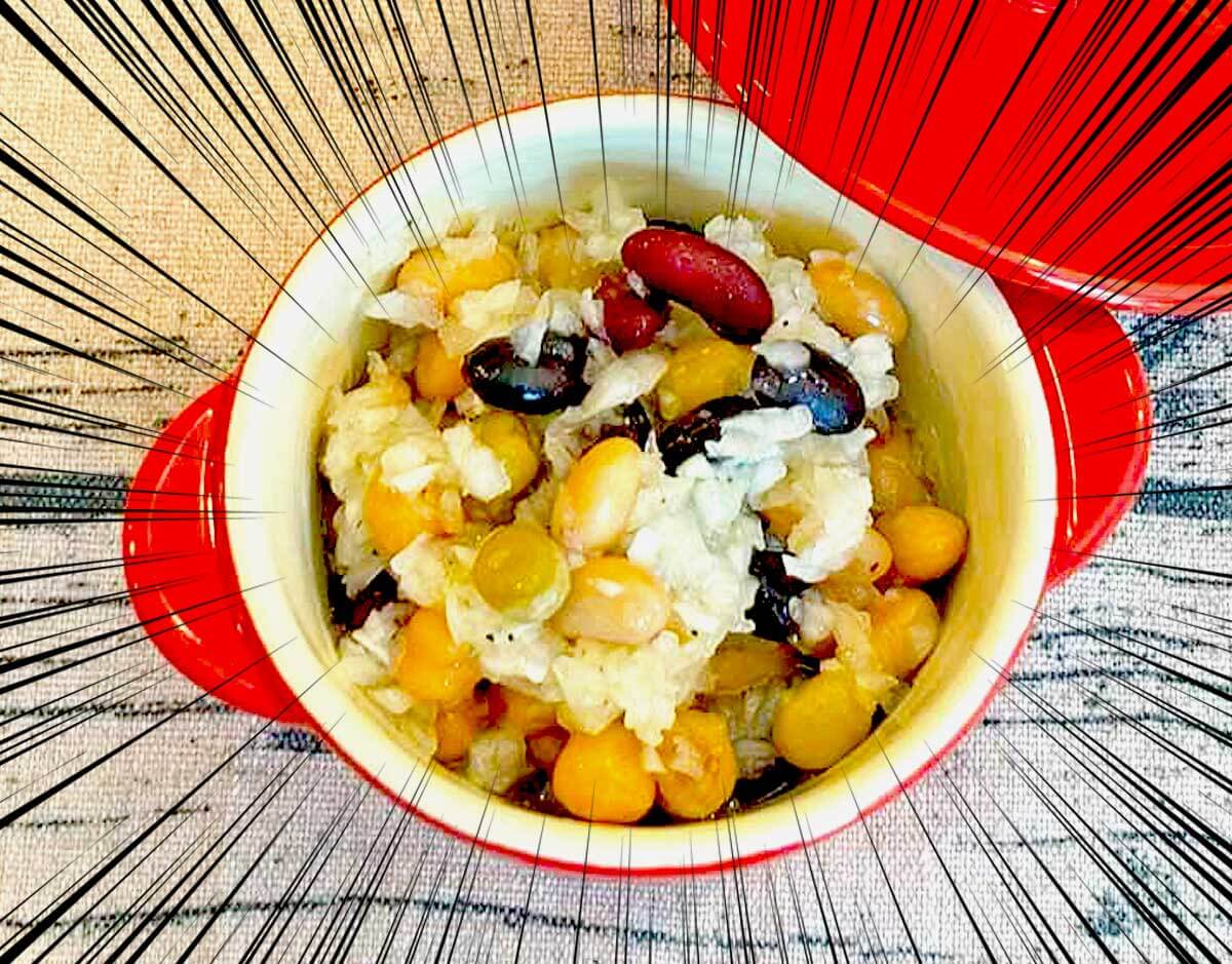 冨永さんは豆を一晩水に漬けてから茹でるという丁寧な作り方をしていましたが、今回は市販のミックスビーンズを使ったお手軽版です。