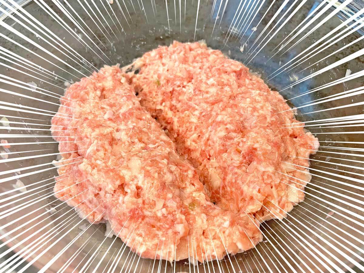 ボウルに豚ひき肉、コショウを振り、粘り気が出るまでよくこねる。