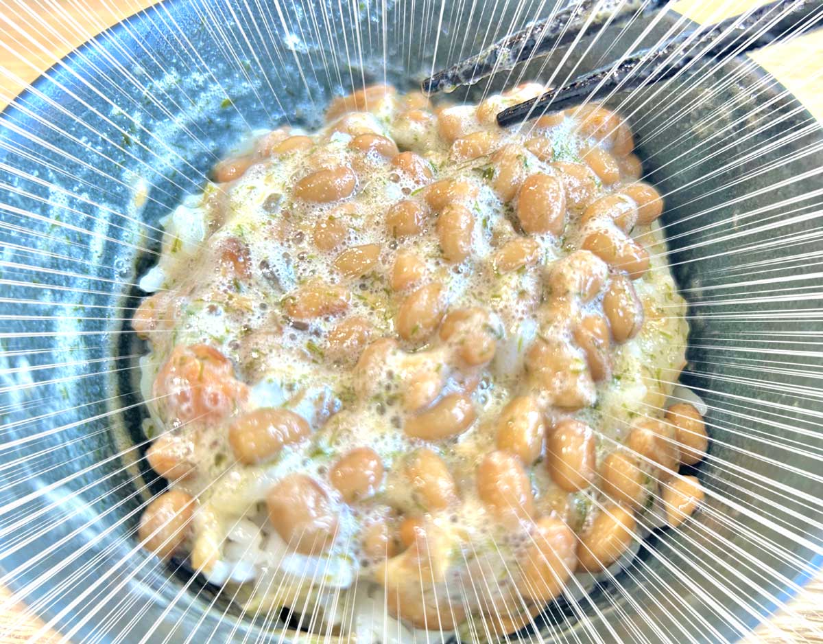付属の納豆のたれ、あおさを加えてさらに混ぜる。