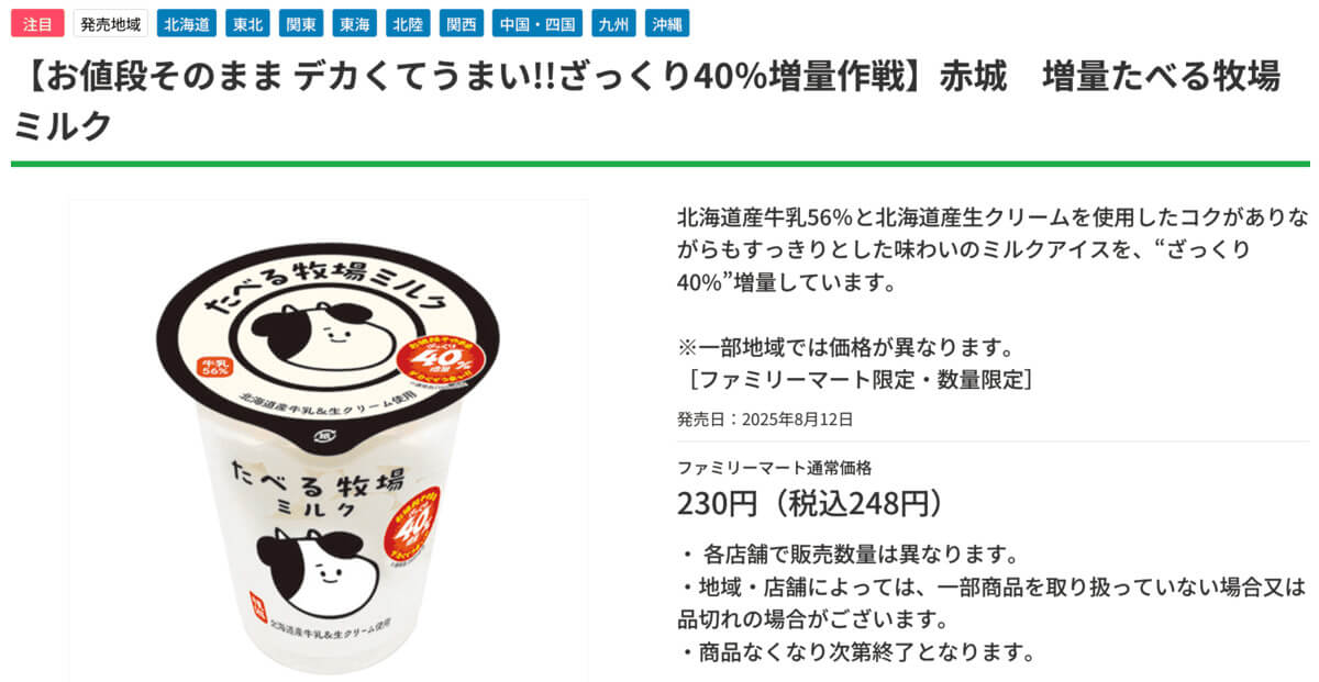 8月12日からは「赤城 増量たべる牧場ミルク」も登場。