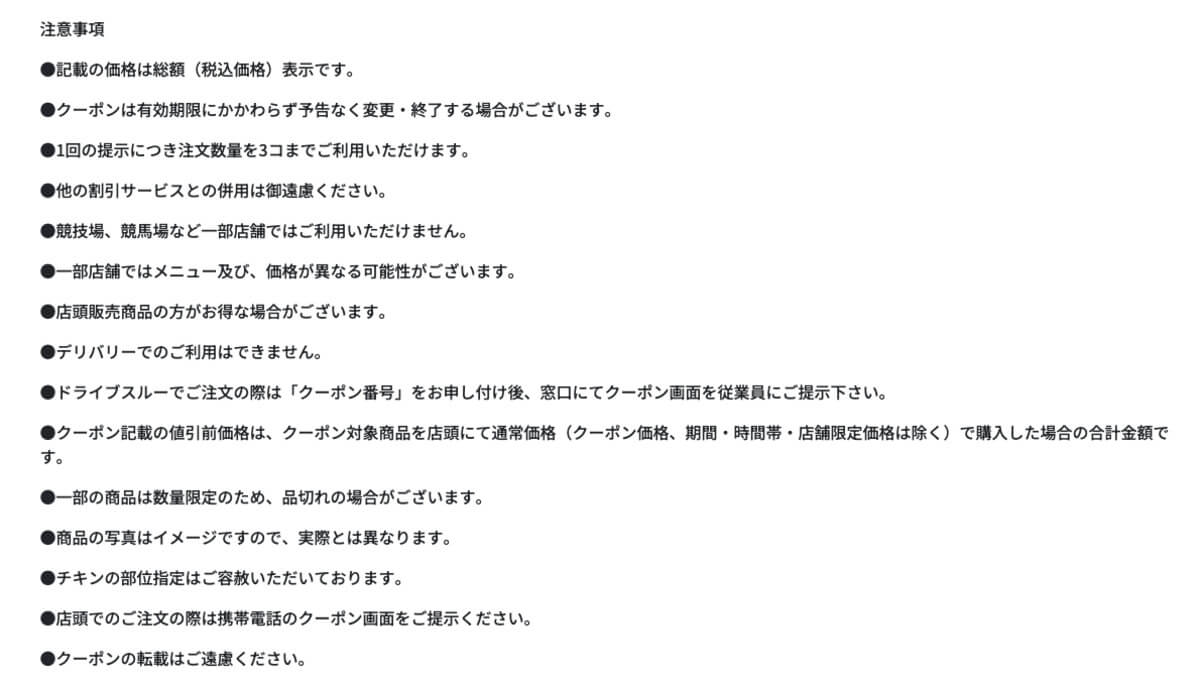 今回、「チキンフィレバーガー、クリスピー、ポテトS」のクーポンが登場しました。(※この画面の提示では割引になりません)