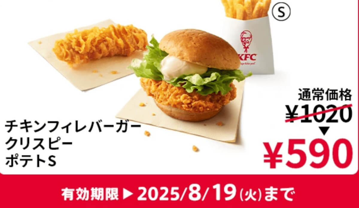 ケンタッキーフライドチキンでは、「チキンフィレバーガー、クリスピー、ポテトS」のクーポンを配信中。