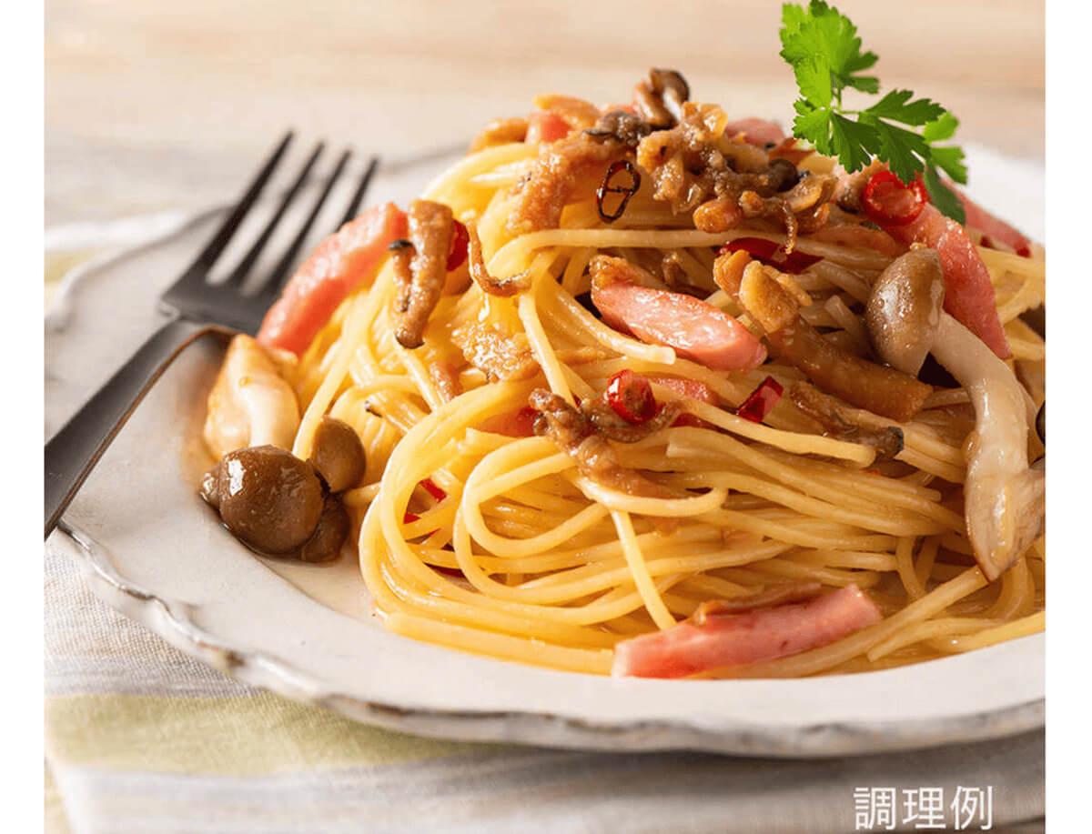 まろやかでクセのないこめ油に、しめじとちりめんじゃこの旨み、生にんにくの香りが溶け込んだ絶品パスタソースです。