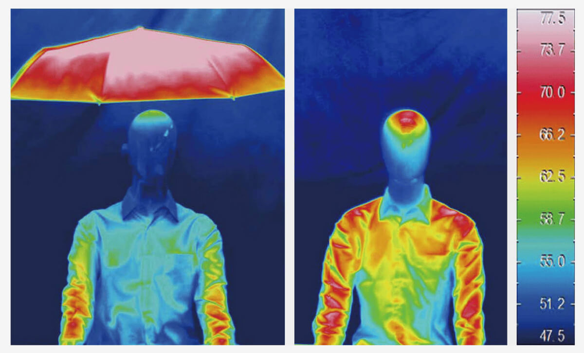 ※左の画像は日射一時間照射後の傘ありとなしを比較したマネキンサーモグラフィ画像(カラーはナチュラルを使用)