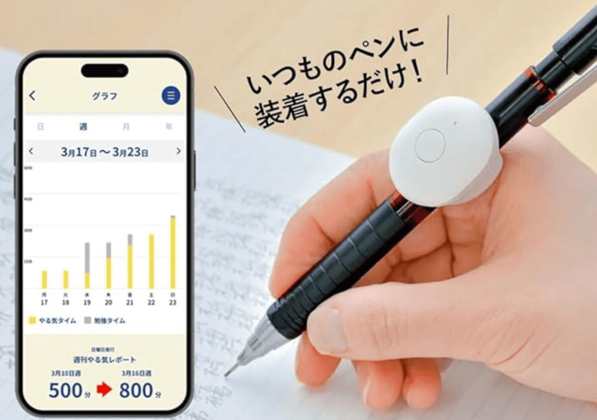 デバイスをペンに取り付けて専用アプリと連携することで、学習データを記録・分析し、IoTテクノロジーを活用して、書いて学んだ時間を可視化します。