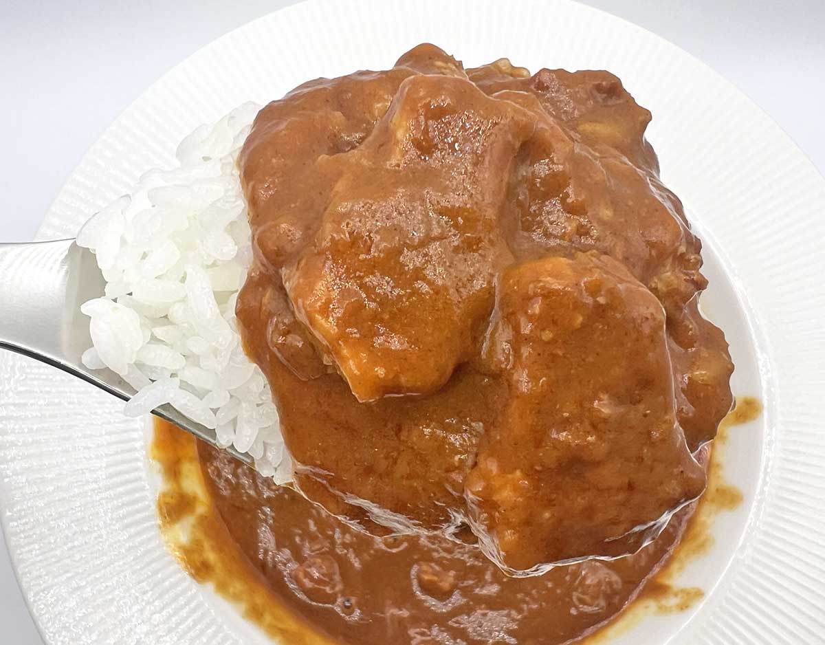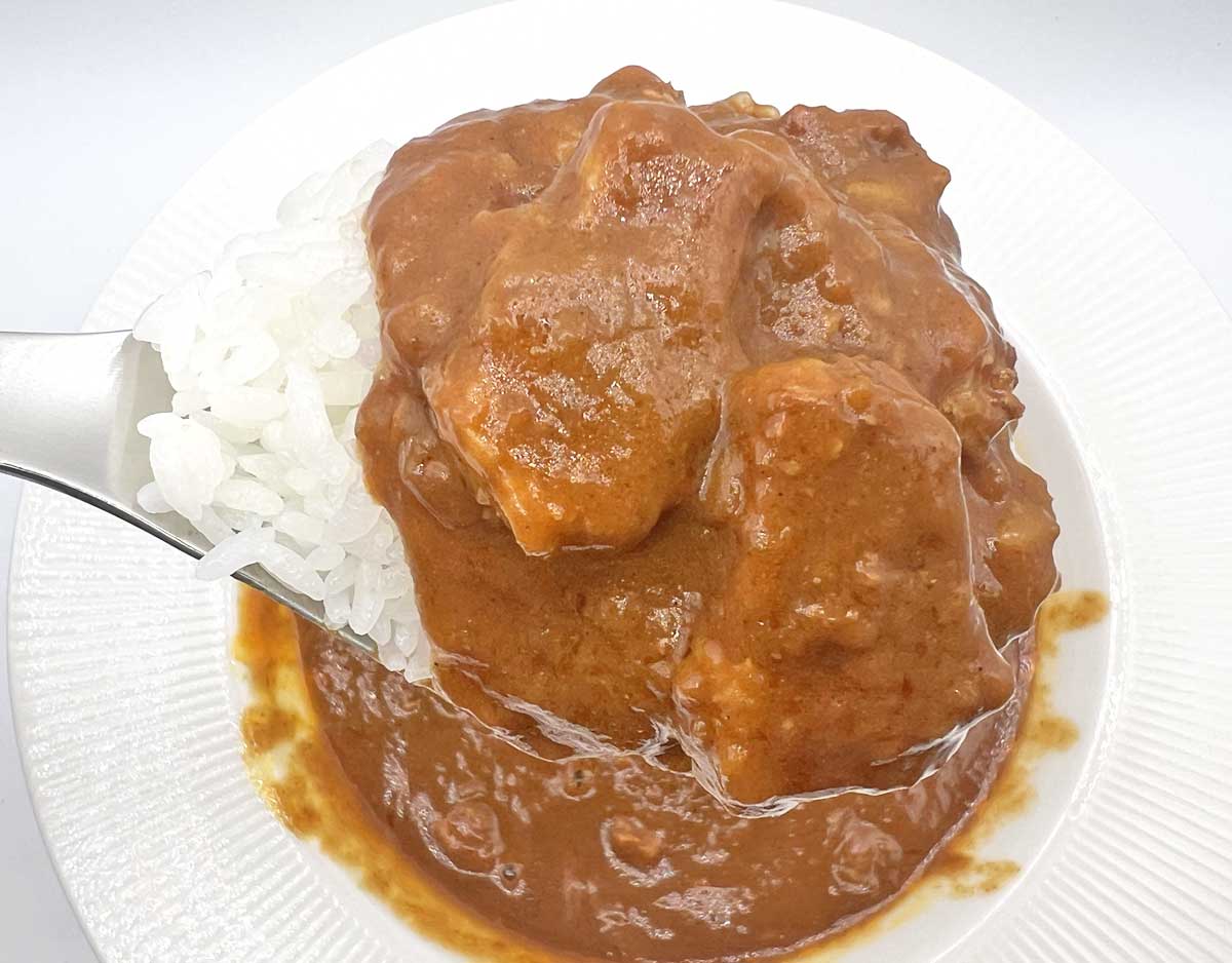 無印良品の「素材を生かした 牛ばら肉の大盛りカレー」は、牛肉の旨みと炒め玉ねぎの甘みを生かし、数種のスパイスで奥行きのある辛さに仕あげました。満足感がある大盛りカレー。