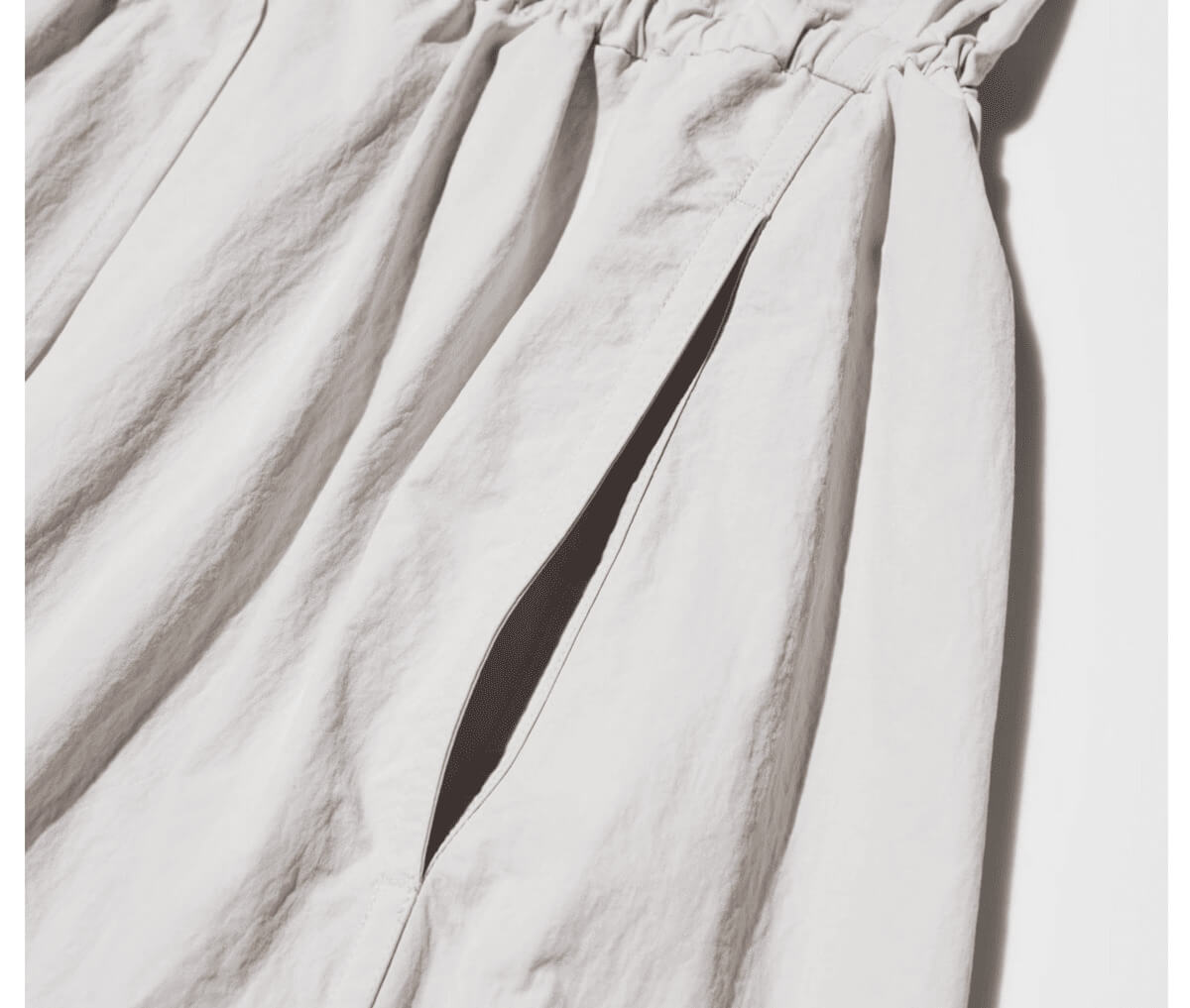 サイドシームポケットにはスマホなどを収納可能。さらにウエストのドローストリングを使えば、好みのフィット感にアレンジできます。
