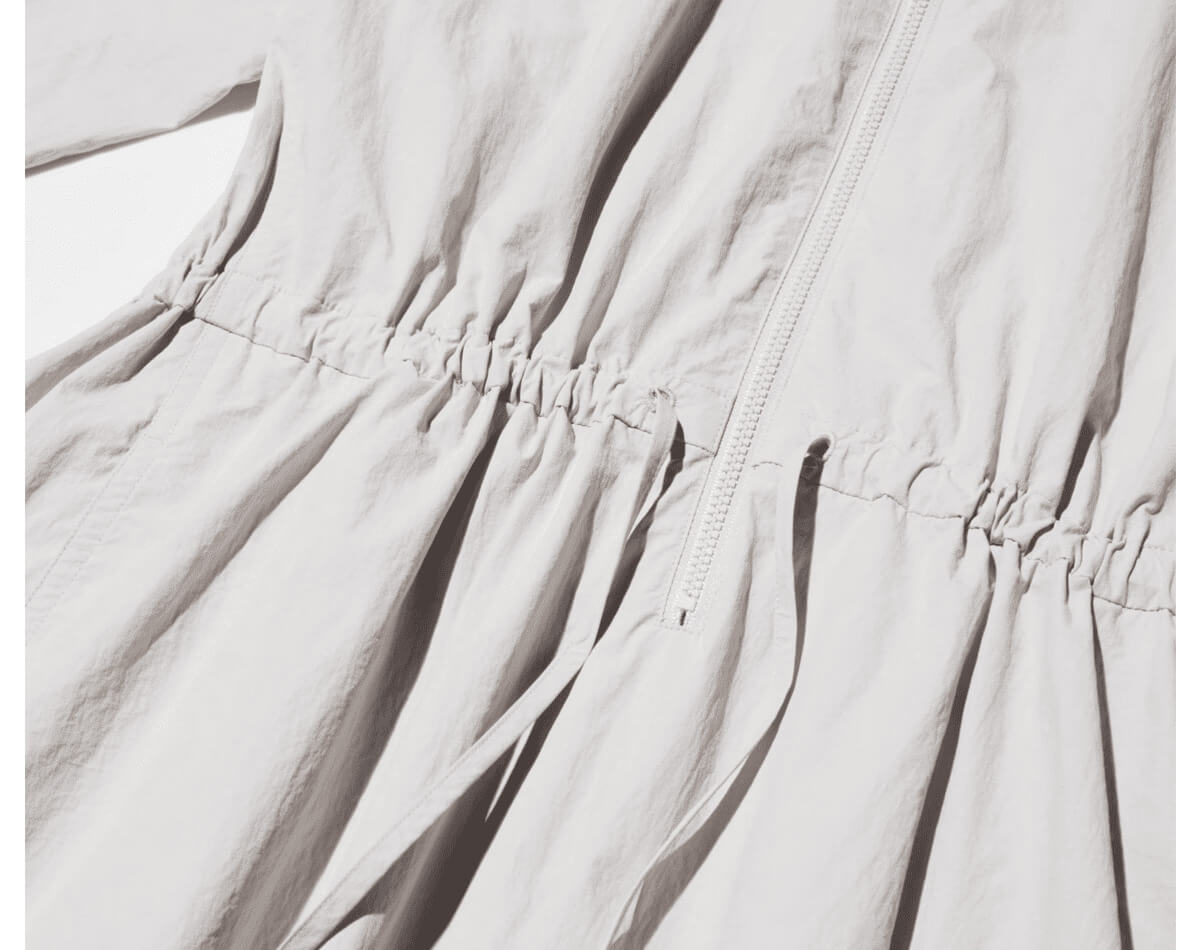 胸元からウエストまで開くジッパー仕様のため、着脱はもちろん授乳もしやすいという点から育児中のママにも好評。さらにウエストのドローストリングで、体型や好みに合わせてシルエットを自由に調整できます。