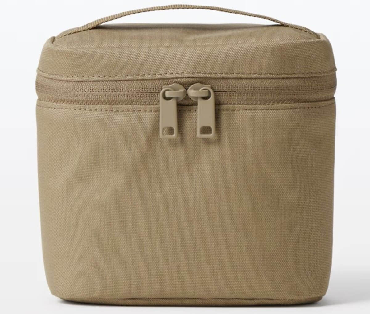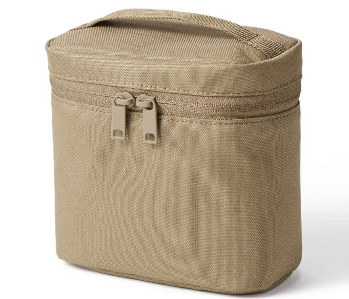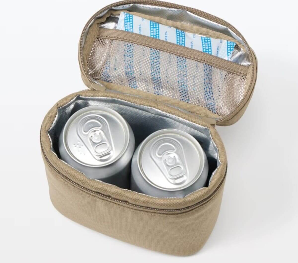 「保冷バッグS」は、フタの上側に持ち手が付いた約14×15×8㎝の保冷バッグ。350mL缶が2本入る小さめのサイズながら保冷効果が持続する4層構造で作られており、保冷剤を入れるポケットが付いているのもポイントです。