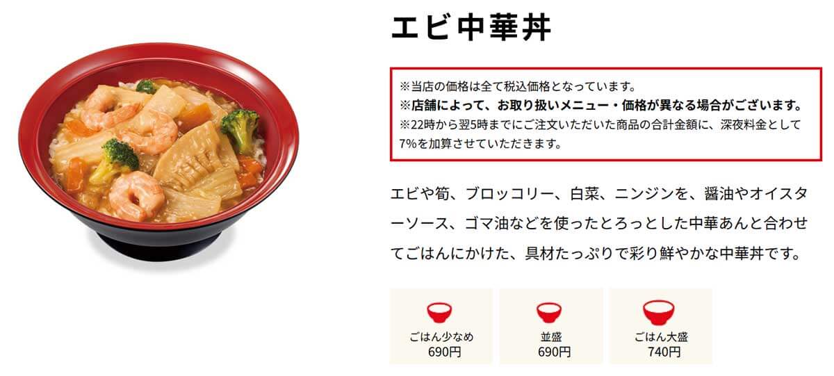 「エビ中華丼」の価格は、ごはん少なめ 690円、並盛 690円、ごはん大盛 740円です。