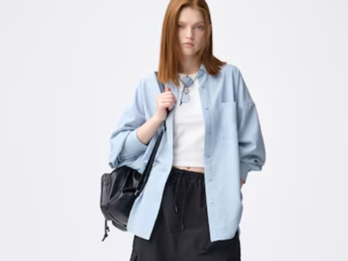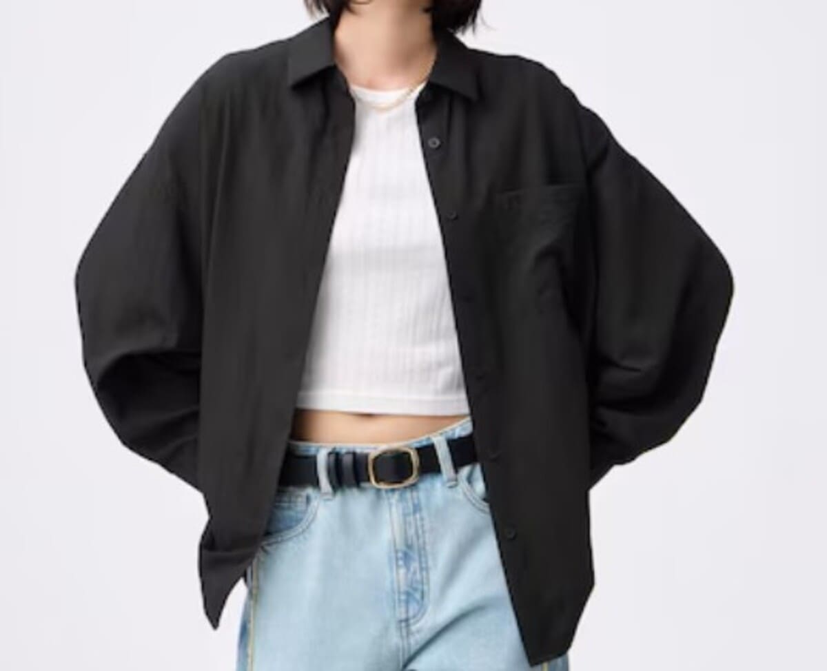 GUの「ドルマンスリーブシャツ」は、体のラインを拾わず、腰まわりまで自然にカバーしてくれるオーバーサイズシルエットが特徴です。
