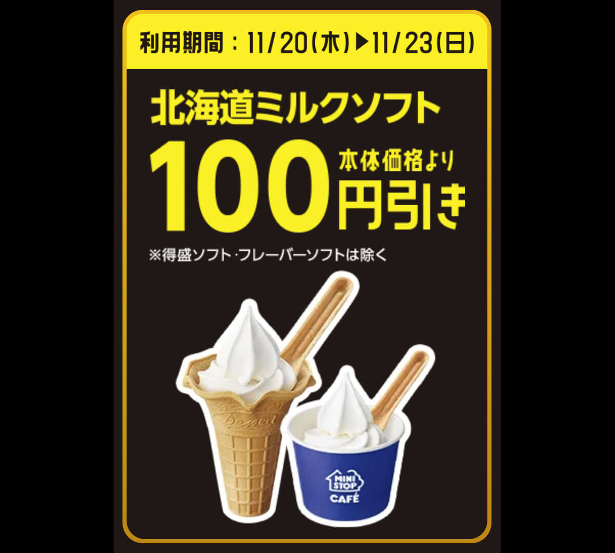「北海道ミルクソフト」100円引きは、ミニストップ好きなら見逃せないですね。