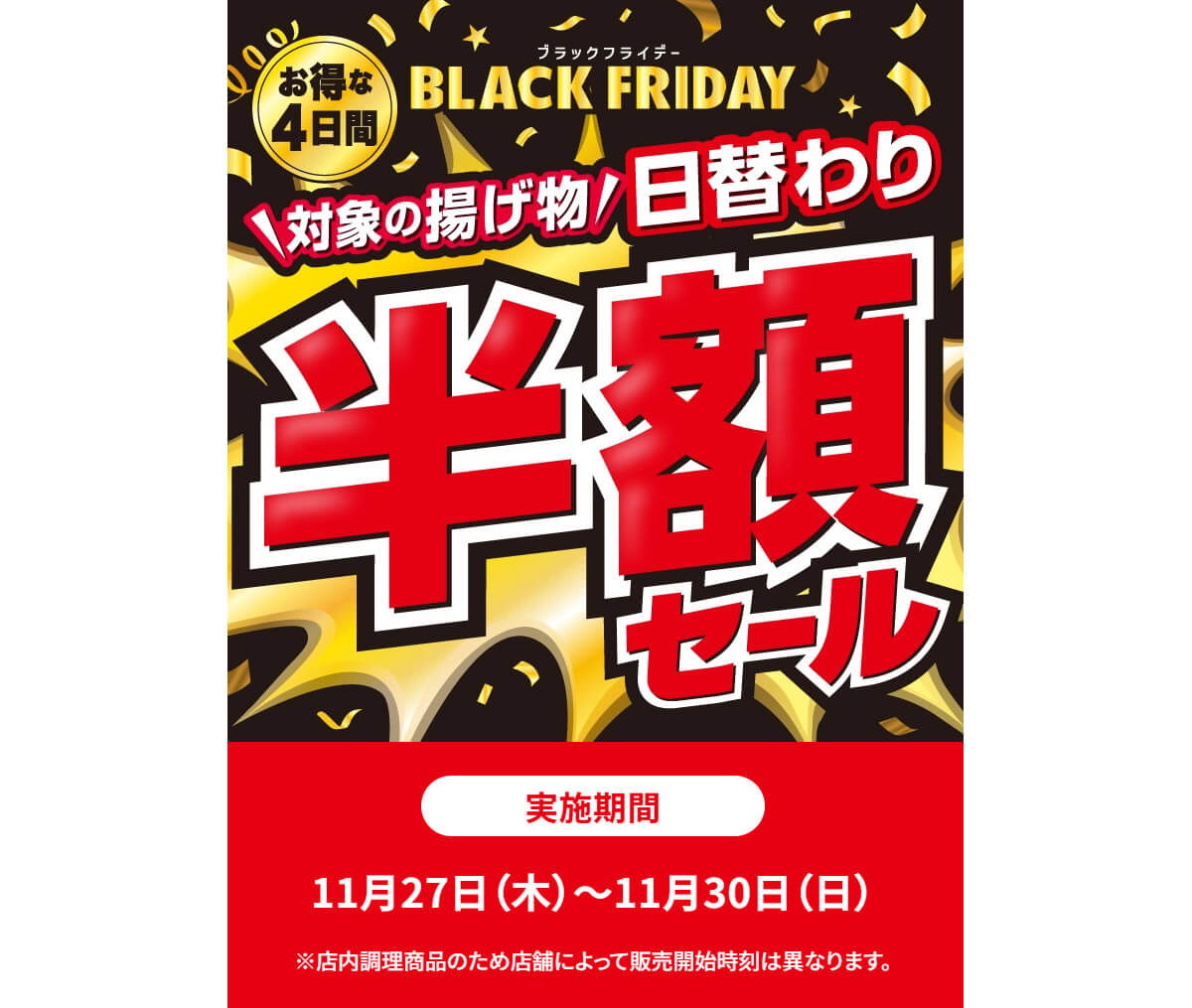 セブンイレブンでは、ブラックフライデーに合わせて、対象の揚げ物商品が日替わりで半額になるお得なセールを、11月27日から30日の4日間限定で開催します。