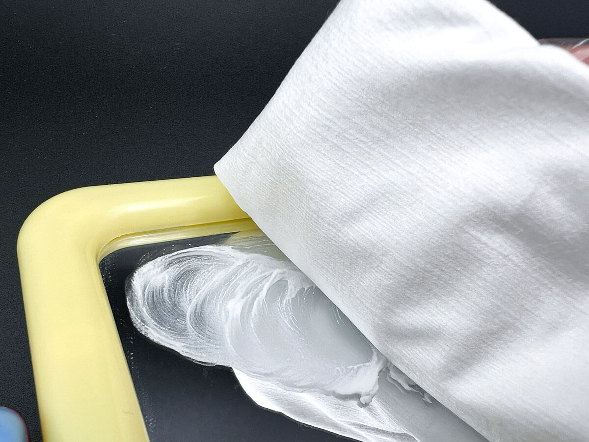 説明書の通りに、柔らかい布に少量のクレンザーを取り、磨いてみます。